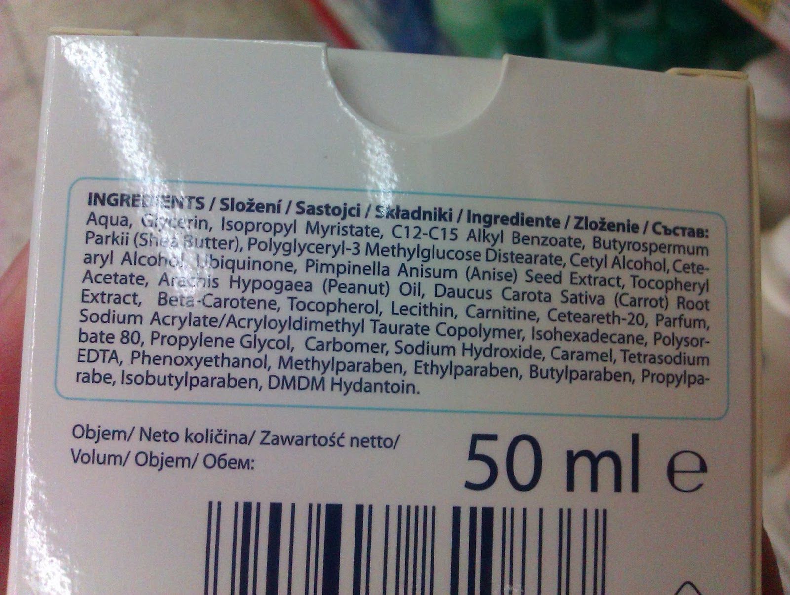 Skład mocno, pozytywnie zaskakuje: zaraz po wodzie sok z aloesu!, gliceryna, emulgatory, olej z pestek moreli, wit. E, wit. B5, masło shea, silikon, zagęszczacze, jest i parfum, a potem w mniejszych ilościach: bisabolol, cynk, lecytyna, wit. C, fruktoza, glicyna, inositol, kwas mlekowy, wit. B3, mocznik, ekstrakt z imbiru